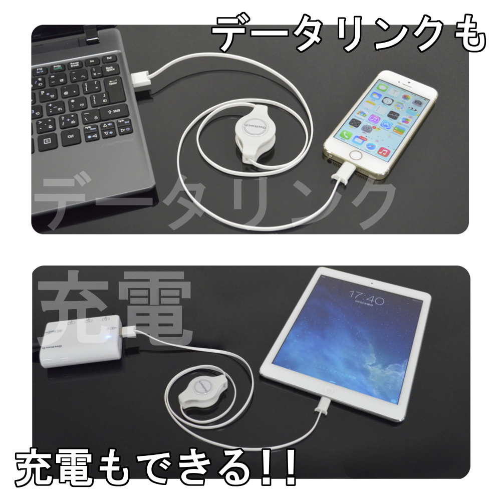 充電にもデータ通信にも使えて,巻き取り式なので,カバンの中でかさばらなくて,こんがらがったりしない。