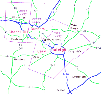 チャペルヒル・カルボロ:チャペルヒルには学生向きのアパートがたくさんあります。犯罪率もそれほど高くないので,比較的安心して住むことができます。カルボロやUNCのまわりには多少危険なところがあるようです。どちらにしろ環境の悪いところは,車や家の塗装など,街並みの雰囲気ががらっと変わるので,気が付くはずです。ただし日本に比べて人口密度が低いので,単に人通りが寂しいというだけでは,判断できません。また,学生に人気のあるところを選ぶと,突然始まる真夜中のパーティに悩まされることがあります。Airport Road沿いに住む日本人が多いようです。